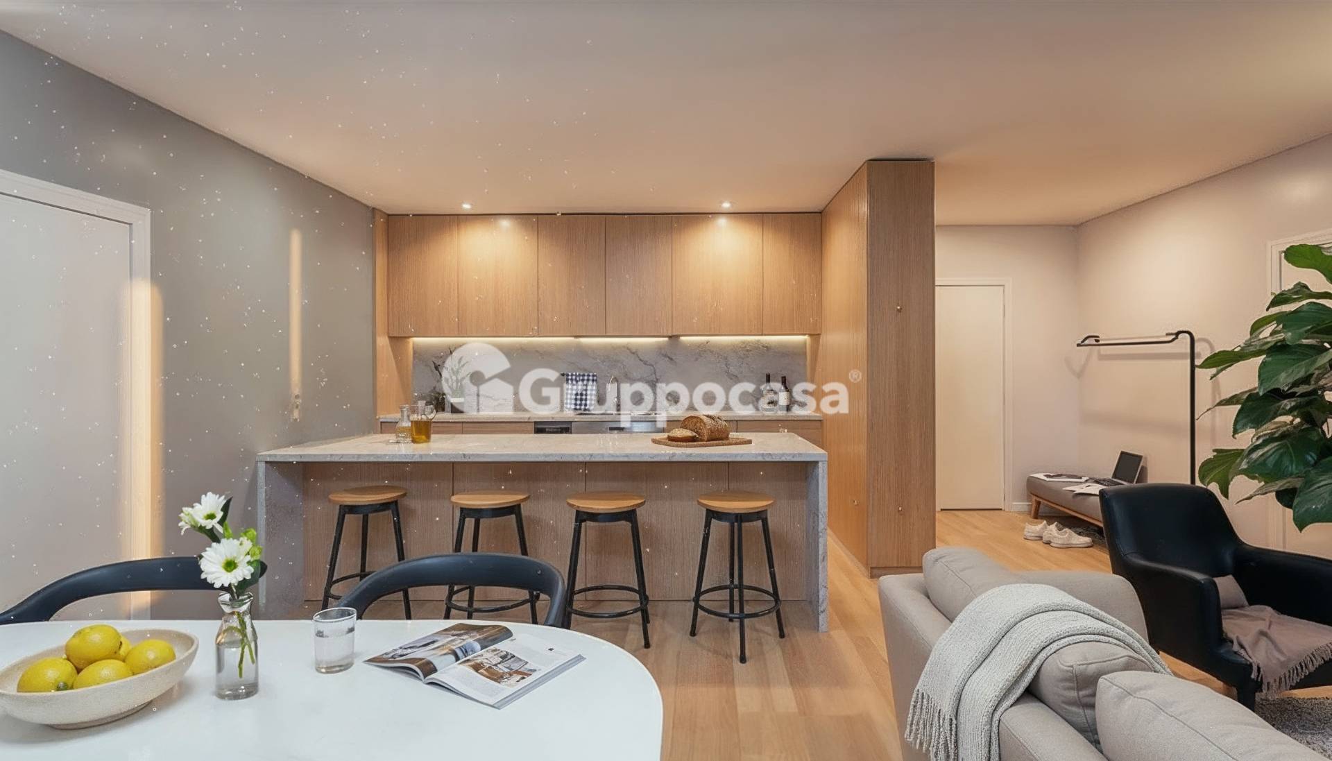 La zona giorno, con cucina a vista, comprende un soggiorno ampio e luminoso, che si apre su un grande terrazzo affacciato a sud, perfetto per cene all'aperto e momenti di relax.