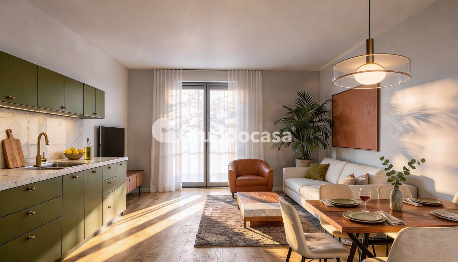 È inoltre possibile ripensare l'immobile con un taglio più moderno, realizzando una zona giorno in open space con cucina a vista e ricavando un secondo bagno, come da soluzione rappresentata nei render. In questa configurazione (come da planimetria nella galleria fotografica), il trilocale mantiene la doppia esposizione e valorizza ulteriormente la fruibilità degli spazi.